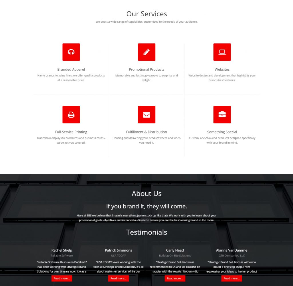 Strategic Brand Solutions wanted to give themselves a fresh look on their website and business cards, as well as a promotional email making their clients aware of their new look and available products. The end result was a simplified look applied across a responsive website.